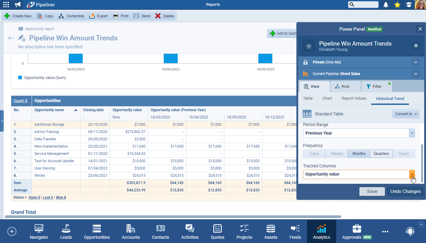 Historical trends represent a series of dates, similar to comparison dates and can be used when a user wants to track changes over a longer period of time. The user also defines the frequency of generated comparison dates relative to the chosen period — for example, track values over the last year with a quarterly frequency. The only fields supported as “Tracked Columns” for historical trends are numeric fields. One historical column is created for each tracked field column (for example, Opportunity Value over the Previous Year) and, when added to the report, will display with sub columns for each frequency (e.g. a value will be displayed for each quarterQuarter Quarter is a three-month period in a company’s fiscal year commonly used to make comparative performance analyses, detect or forecast business trends, report earnings, and pay shareholder dividends. of the previous year if the chosen frequency was Quarterly). ⤵