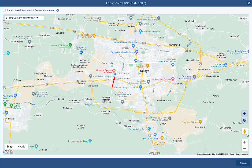 Once all Activities are synced from the Mobile App to the web app, it will be possible to add the Geolocation field to the “Activities List View” and clicking on the “Geolocation” field will show a map view with the location of where that Activity was created. ⤵