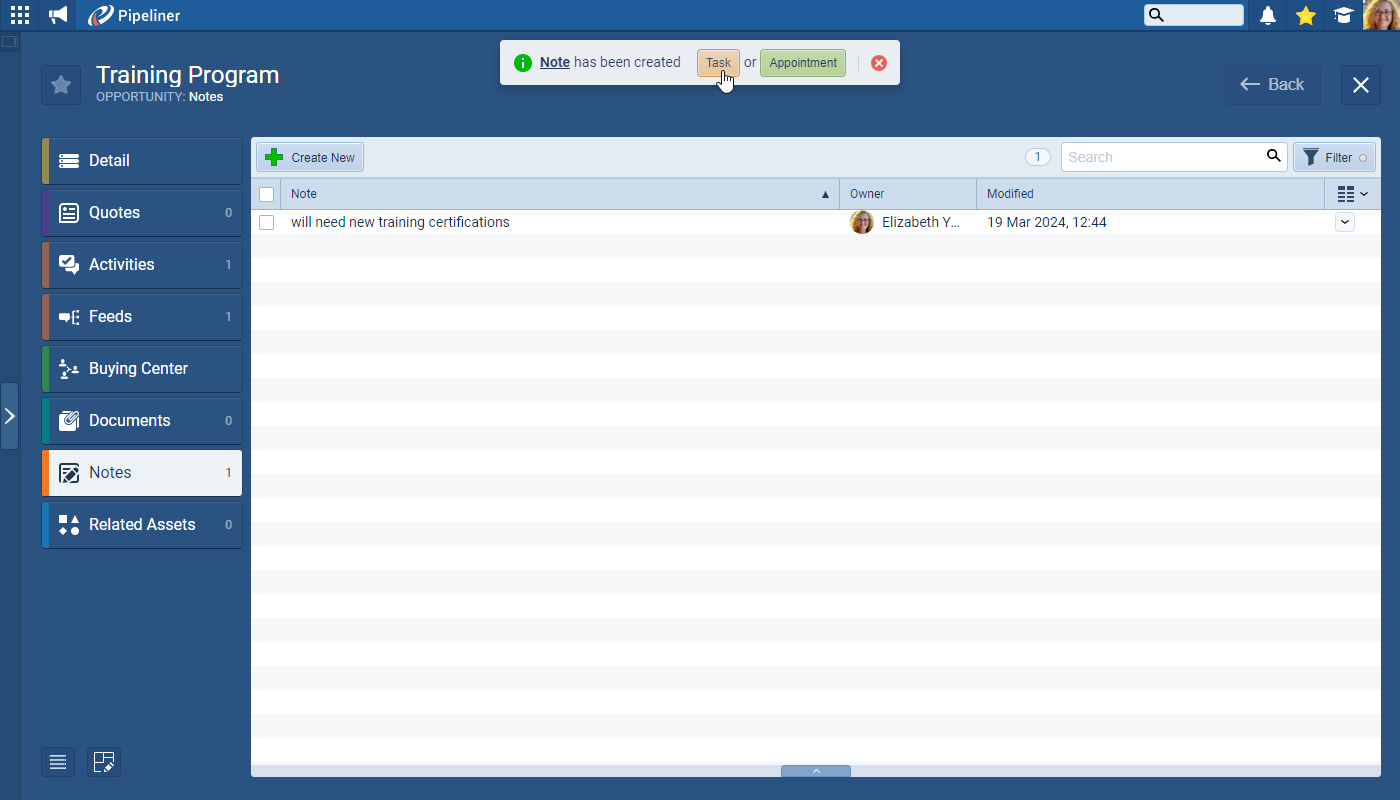 When “Notes” are created, users are now prompted to create follow up activities. ⤵